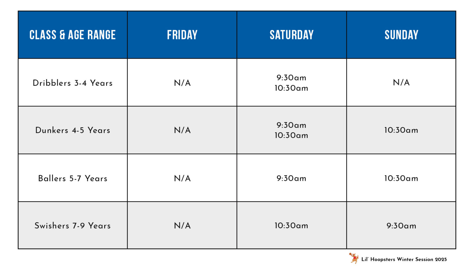 Lil’ Athletes offers make-up classes for the amount of classes you may miss in a single session.